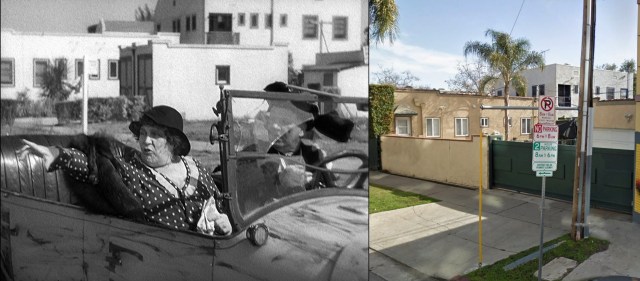 Look closely and you’ll notice a trolley passes Charlie as he struggles exiting the taxi. The Lone Star Studio stood a short block south of the Santa Monica Blvd trolley line, and at the time the area was sparsely developed. It would have been efficient to film the scene on Santa Monica near the studio, but they didn’t. Analyzing vintage photos and historic maps show the details just don’t match.