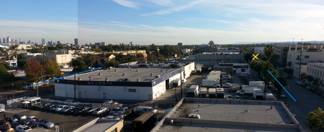 Click to enlarge – the same Metro Studio corner, looking to the NW at left, and to the SE at right, with Buster’s studio in the foreground for reference. HollywoodPhotographs.com
