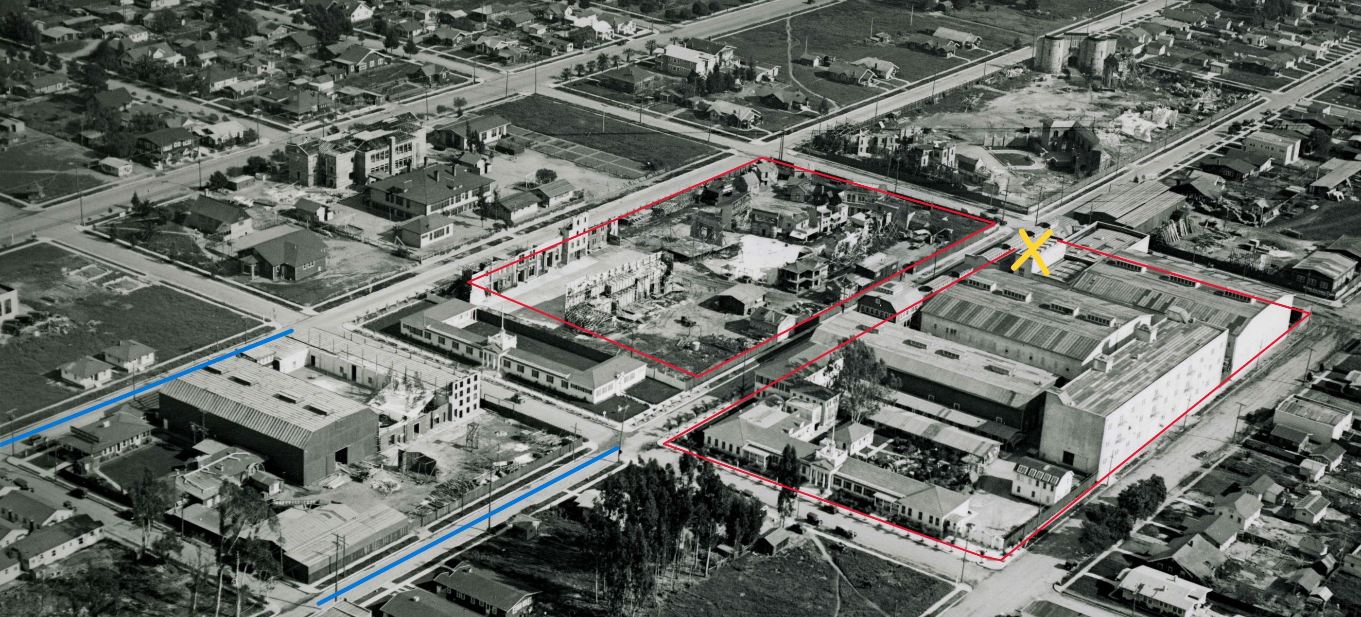 Taken from the storage building, a modern view south of the Keaton Studio site between the blue lines running north from Romaine to Eleanor, and Bill’s corner of Willoughby and Cahuenga (X).