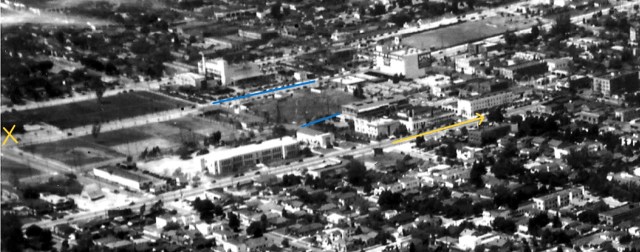 Compare this similar view, circa 1931, also showing Buster’s path north up Vine (arrow), and the corner of Willoughby and Cahuenga where Fields filmed (X). The Keaton Studio and large filming stage once standing between the blue lines are fully demolished, with the small KMTR buildings now standing on the west side of the lot.
