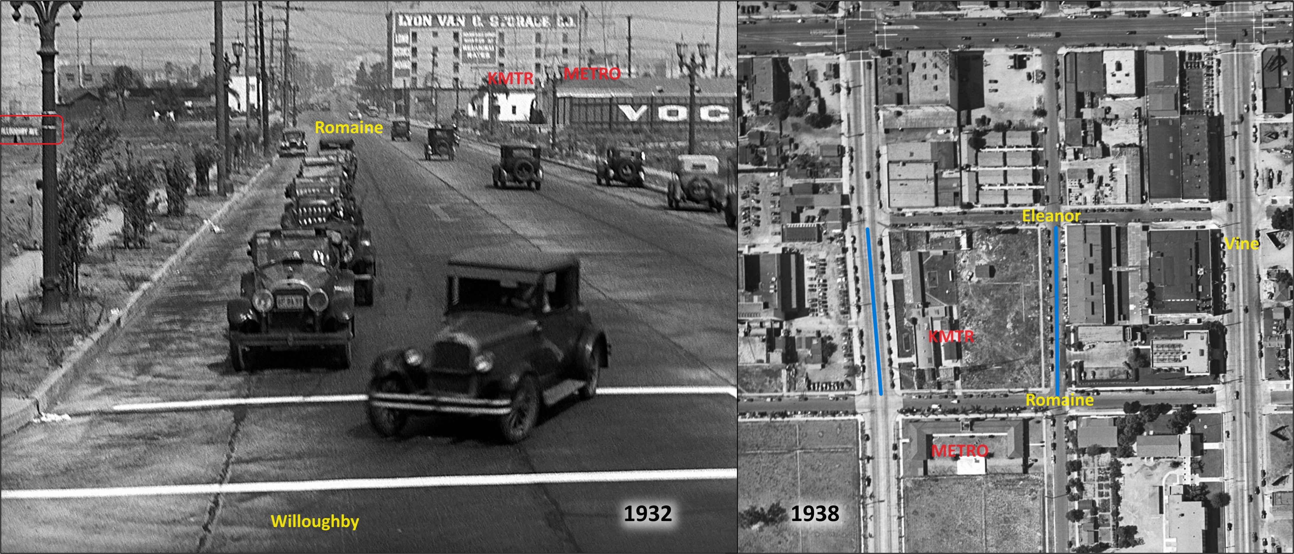 Click to enlarge – matching the 1932 movie frame annotated with a 1938 aerial view both looking north. The Keaton Studio stood between Cahuenga and Lillian Way (blue lines) and Eleanor and Romaine. KMTR sits on the west side of the studio site, the east side is a vacant lot. The former headquarters building for the Metro Studios below Keaton’s studio, which shut down in 1924 to join M-G-M in Culver City, is still standing in 1938.