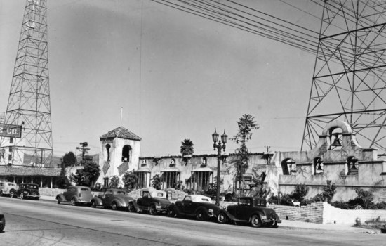 Here’s a 1938 view of KMTR where Buster’s studio once stood. The photo archive misidentifies the address as “La Brea”, but you can see the storage building to the left, and the series of buildings here match the profile in the 1938 aerial view above. LAPL.
