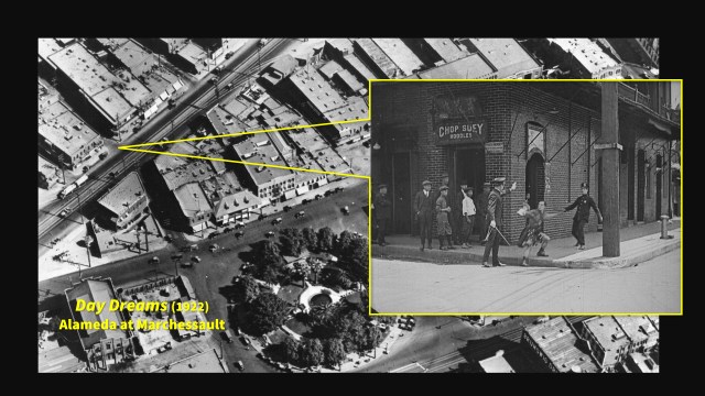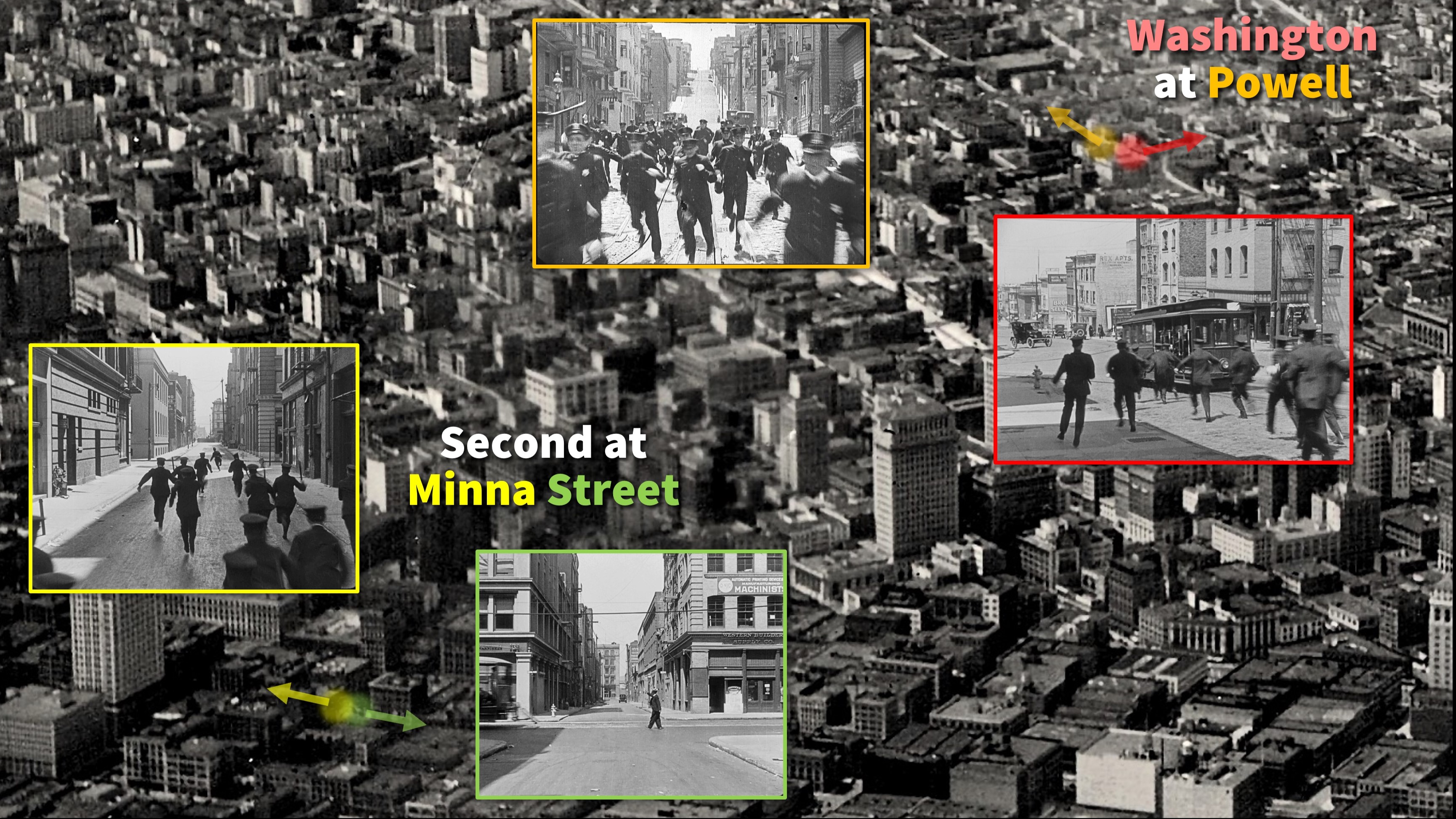 Click to enlarge – to begin, this 1922 aerial photo of the SF North Beach neighborhood reveals four Day Dream scenes; filmed looking west from Lombard at Taylor (red), looking east from Bay at Taylor (orange), east from Lombard at Columbus (yellow), and south from Lombard at Columbus (green). Notice how Buster filmed efficiently on flat streets relatively close together. David Rumsey Map Collection.