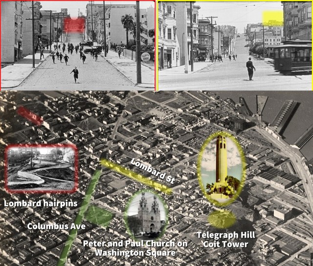 Three SF landmarks, the Lombard Street hairpin turns, Coit Tower, and Saints Peter and Paul Church on Washington Square, are absent in the above image. They would have appeared in the background of Buster’s scenes, but they hadn’t been built yet! The images below shows their future locations. OpenSFHistory.org – Lombard – Coit Tower – Saints Peter and Paul.