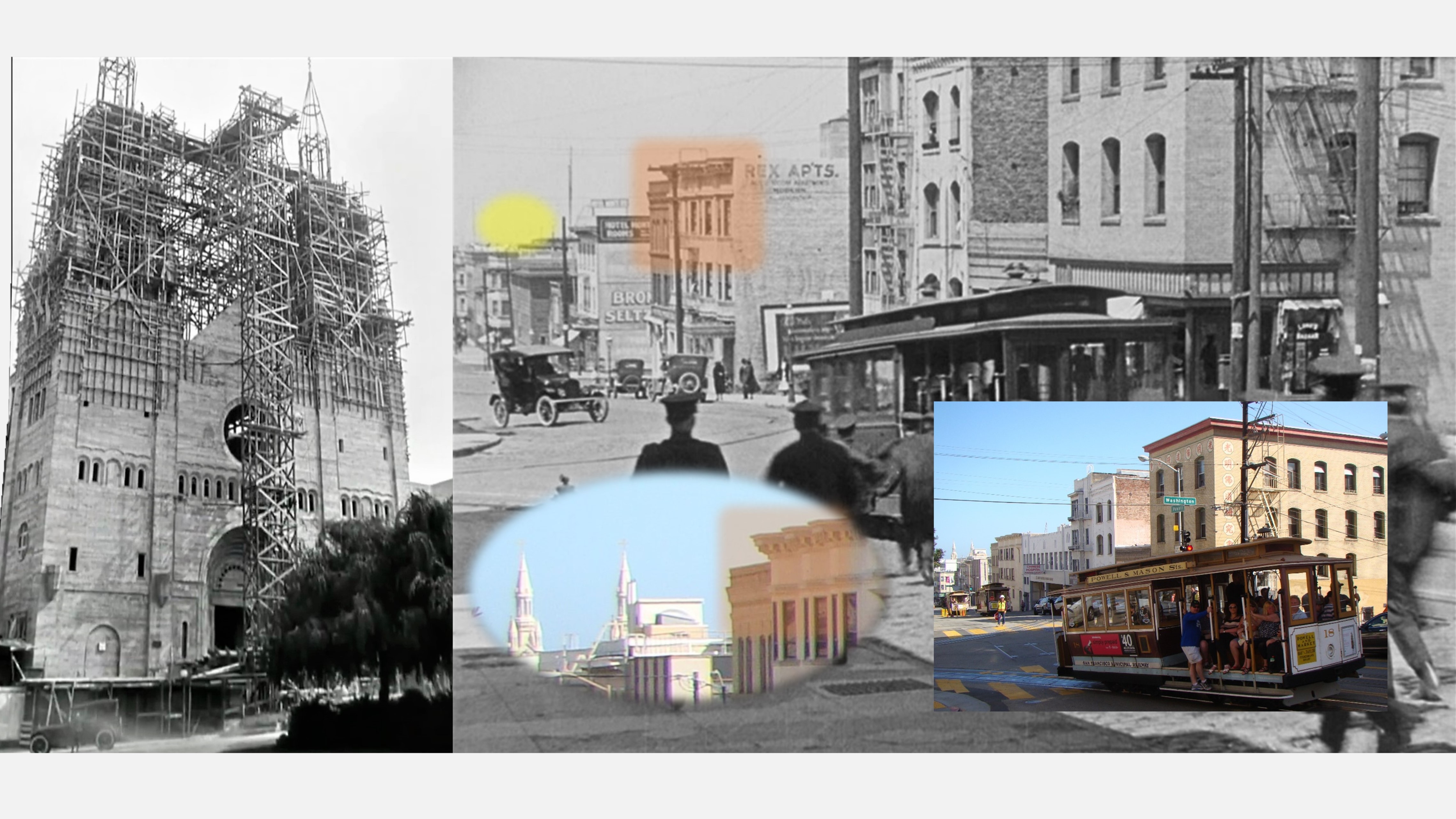 Click to enlarge, the same circa 1922 photo as above, shows the future sites of the three SF landmarks Buster missed because they weren’t built yet. The red and yellow patches in the movie frames above show where the landmarks would have appeared in Buster’s scenes. The church’s missing appearance is explained further below.
