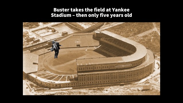 Click to enlarge – does Buster’s body language indicate the startled shock and panic of a three-days-in-bed accident victim desperately grabbing for the ledge? Or someone calmly falling into a net as planned?