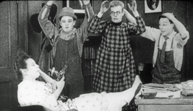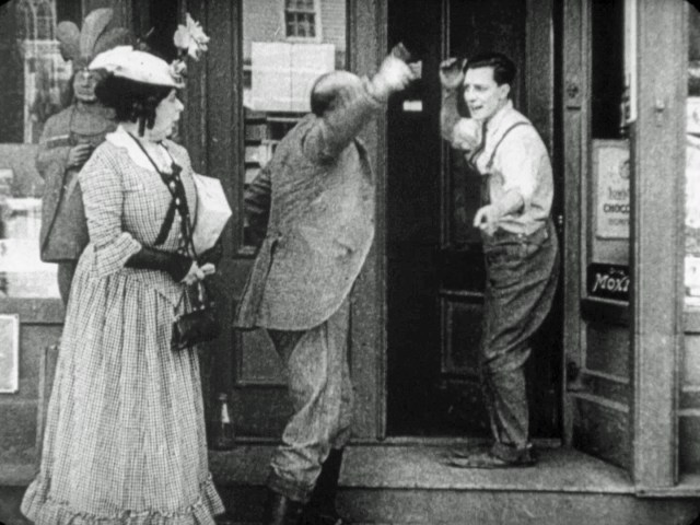 Buster retaliates by throwing a pie! Left-handed as well, so he won’t block view of the action with his body as he flings the pastry stage left. This is the first of only two pies tossed during his entire silent film career (the second was in The Garage), and it’s literally his first day on camera. Since pie-throwing had become somewhat passé by 1917, blogger Lea Stans of Silent-ology fame wonders whether this might have even been a bit of an inside joke — Buster demanding with mock indignation, “What, give up my stage career for some two-bit flicker? I refuse unless you let me toss a pie!”