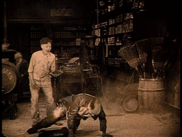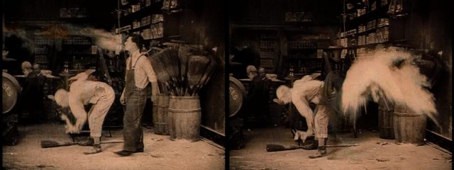 Back inside, Buster is famously knocked to the floor by a sack of flour, his debut cinematic pratfall. Buster relates Roscoe told him it’s hard not to flinch when you’re expecting to get hit, so look the over way, and when Roscoe says “turn,” turn, and the flour sack will be there. The trick works, and as Buster liked to recall, “it put my feet where my head had been.” But then what does Buster do?