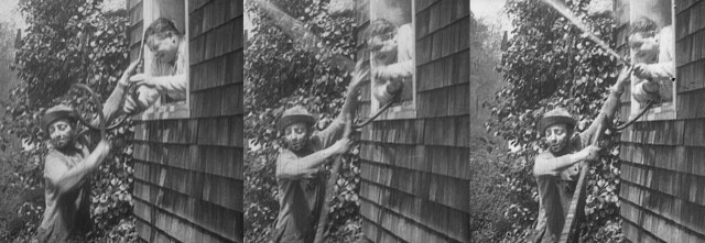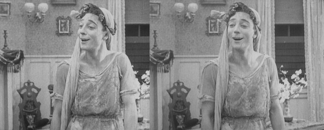 Another fun discovery – Buster in 3D! Different Blu-ray releases of Three Ages are presented from either the A or B camera negative. (Silent movies were commonly filmed with two cameras placed side-by-side. The A camera negative would generate prints for American theaters, while the B camera negative would be sent to Europe to create prints locally.) The parallax offset between two adjacently photographed images creates a 3D effect. It may not be easy, but if you can focus looking forward, beyond these twin images, and cross your eyes a bit, the right image as seen by your left eye will overlap with the left image as seen by your right eye, yielding a 3D image in the center. Richard Simonton, who personally rescued and restored several of Harold Lloyd’s films, and who manages Harold’s photo archives, including thousands of Harold’s 3D images, cropped and aligned these twin images. He reports the images yield a modest effect when viewed with a cardboard 3D viewer.