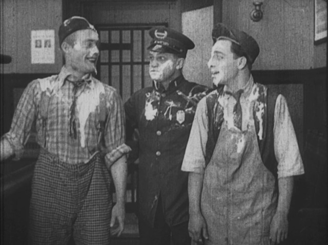 Struck by the pie (see further above), Arbuckle’s co-star and nephew Al St. John returns fire with another bag of flour, missing Buster, and striking that other customer in the face. Buster’s response is to double over laughing at the man’s misfortune.