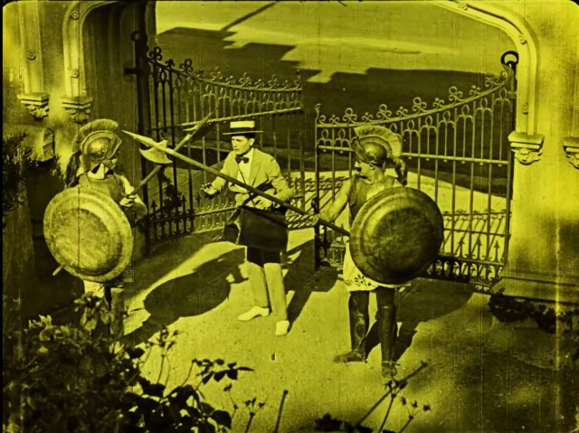 The movie ends with brief postscript finales – caveman Buster and wife, and their 10 caveman kids exit their cave one-by-one. Next, elegant Roman Age Buster and wife and 5 children, all wearing graceful togas, exit their formal columned home. For the final shot in the movie, Present Age Buster and wife exit their Hollywood bungalow, along with … one tiny dog! What a perfect, purely visual joke to end the film.