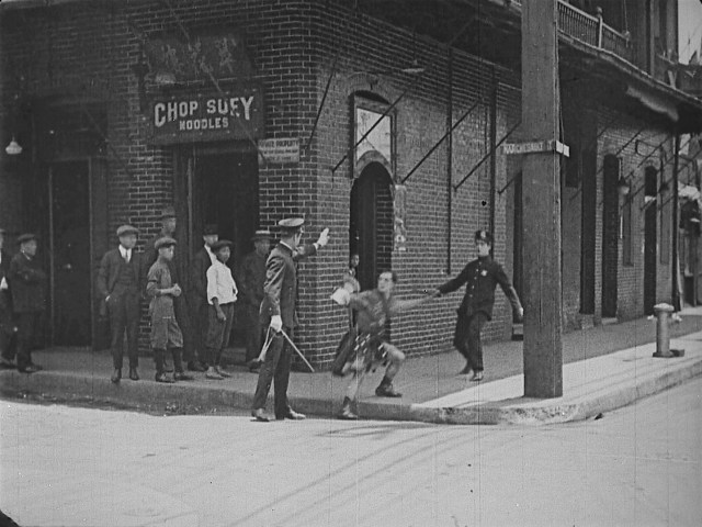 As seen here, during Police Charlie slyly picks the pocket of the thief robbing him (left), matched with an enlarged frame from The Kid (at right). The red frame outlines the Police frame filmed on Sanchez. Unique clues from Neighbors and My Boy confirm Charlie stood beside the back door to store 6 (below).
