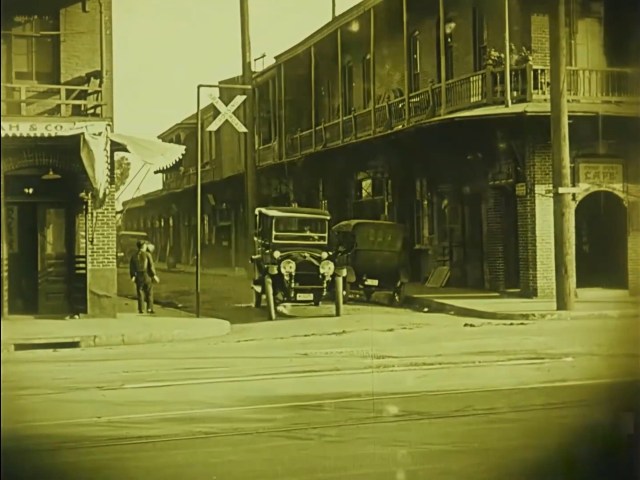 Some film sites remain. As Jackie looks back at the cop chasing him during My Boy you can read the corner “Plaza-Sanchez” street signs above him. The north end of Sanchez facing the Plaza has been preserved.
