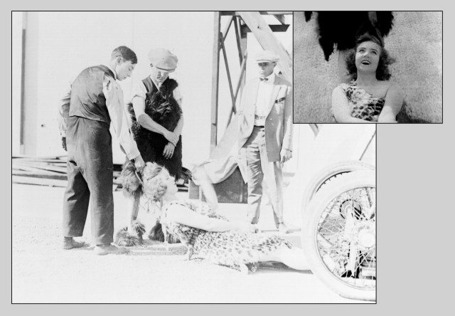 To begin, Buster, didn’t use a stunt double leaping between the buildings, but used a body double for another scene (!) This production still shows Margaret lying on a dolly, a handle hidden in her hair, straddled by the wheels of a camera car. Keaton, directing the scene, is wearing his “working man” costume – notice the vest and the slap shoes. Next to him is a man of similar stature wearing fur shoes and a fur costume over his regular clothes. Clearly this man, and not Buster, is the person dragging Margaret by the hair in the above scene. Given Ms. Leahy’s limited acting skills, perhaps Keaton switched places to supervise the scene more closely.