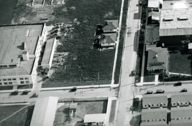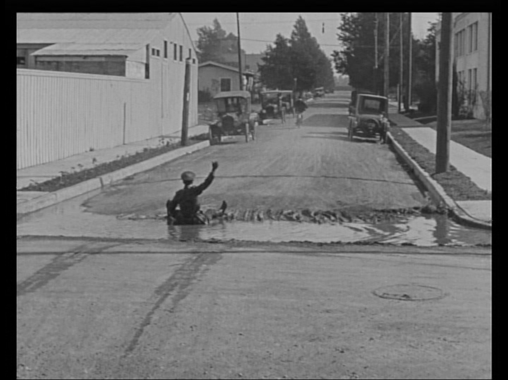 By studying aerial photos of the Keaton Studio taken around the time Sherlock Jr. was in production, we can see that Keaton filmed this stunt within view of the front porch of his studio office. The stunt was filmed looking east down Eleanor at Lillian, with the studio office off-camera to the right. The same intersection, viewed looking south, also appears in Sherlock Jr., as Buster and Ward Crane cross Lillian heading east.