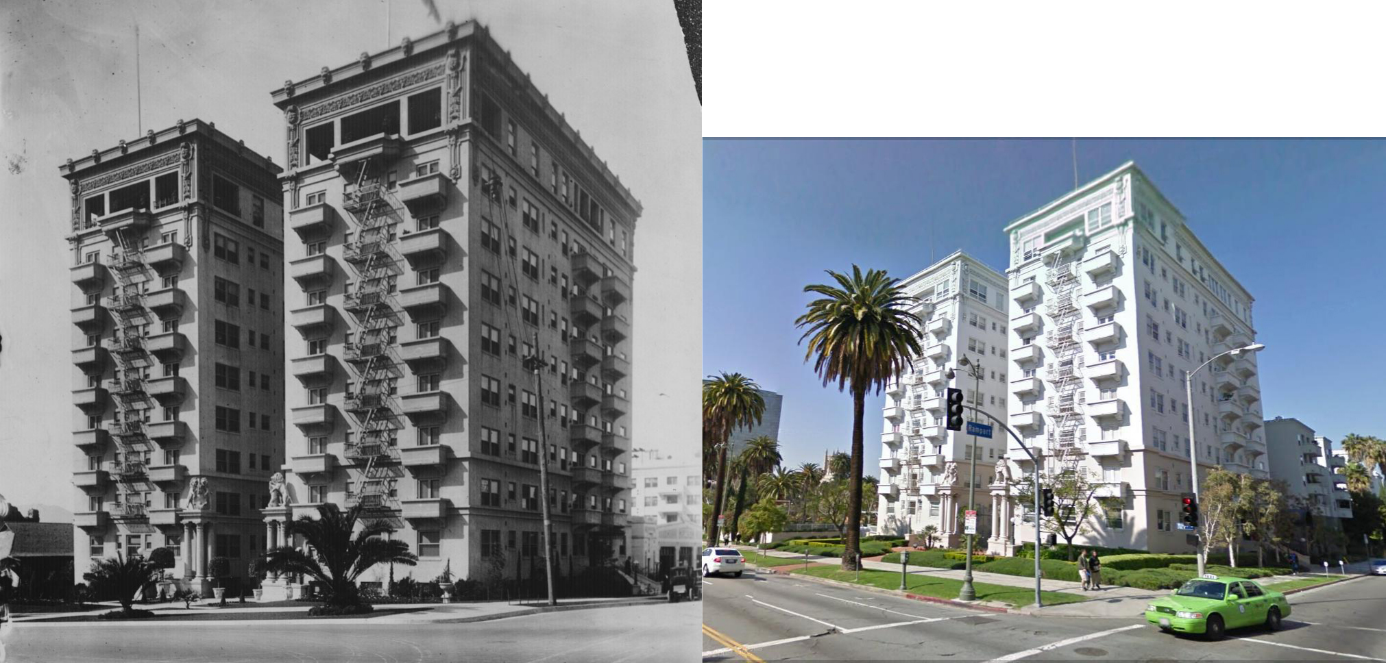 As explained in my book Silent Traces, the Bryson Apartments also appear in the background above Edna Purviance’s head during a scene from Chaplin’s Mutual comedy The Rink (1916), where Charlie meets Edna on the street beside the home of William Henry Cline, at the SE corner of Wilshire Place and Ingraham (now Sunset Place).