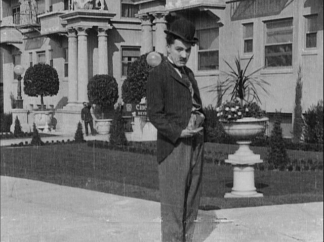 The remarkable image quality of the new Chaplin at Keystone collection from Flicker Alley makes it possible to identify several more scenes from Charlie’s earliest films. As shown here, the extant Bryson Apartments (2701 Wilshire Blvd.) stood in for the front of the Keystone Studios in A Film Johnnie (1914). Presumably Sennett did not believe the actual façade of his studio was sufficiently impressive.