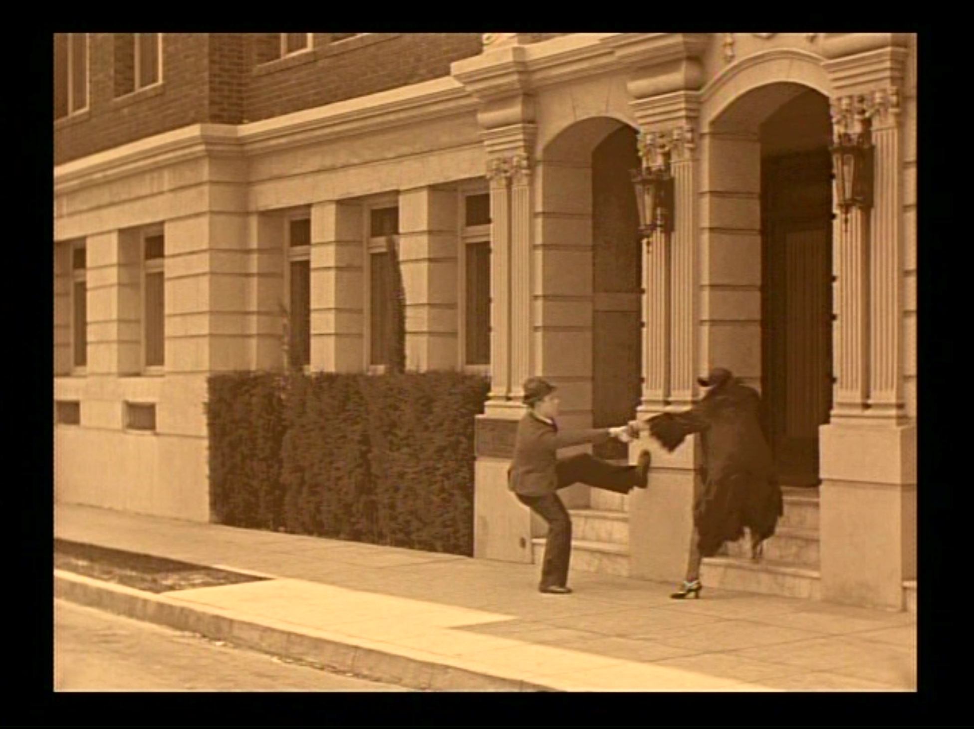 This point of view shot, below, supposedly taken from in front of the apartment entrance looking towards a different building across the street, is actually another view of the same building. For the shot, Harry and Gertrude crossed the street, and posed on the sidewalk with the north end of the same building behind them.