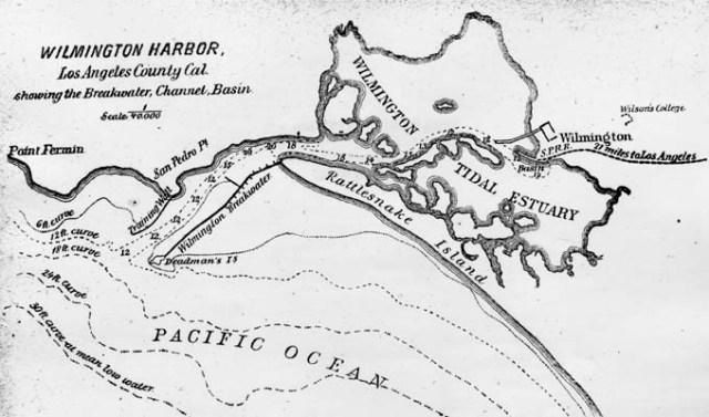 Early map showing Deadman’s Island – Rattlesnake Island would be built up and become known as Terminal Island – Los Angeles Public Library SPNB Collection