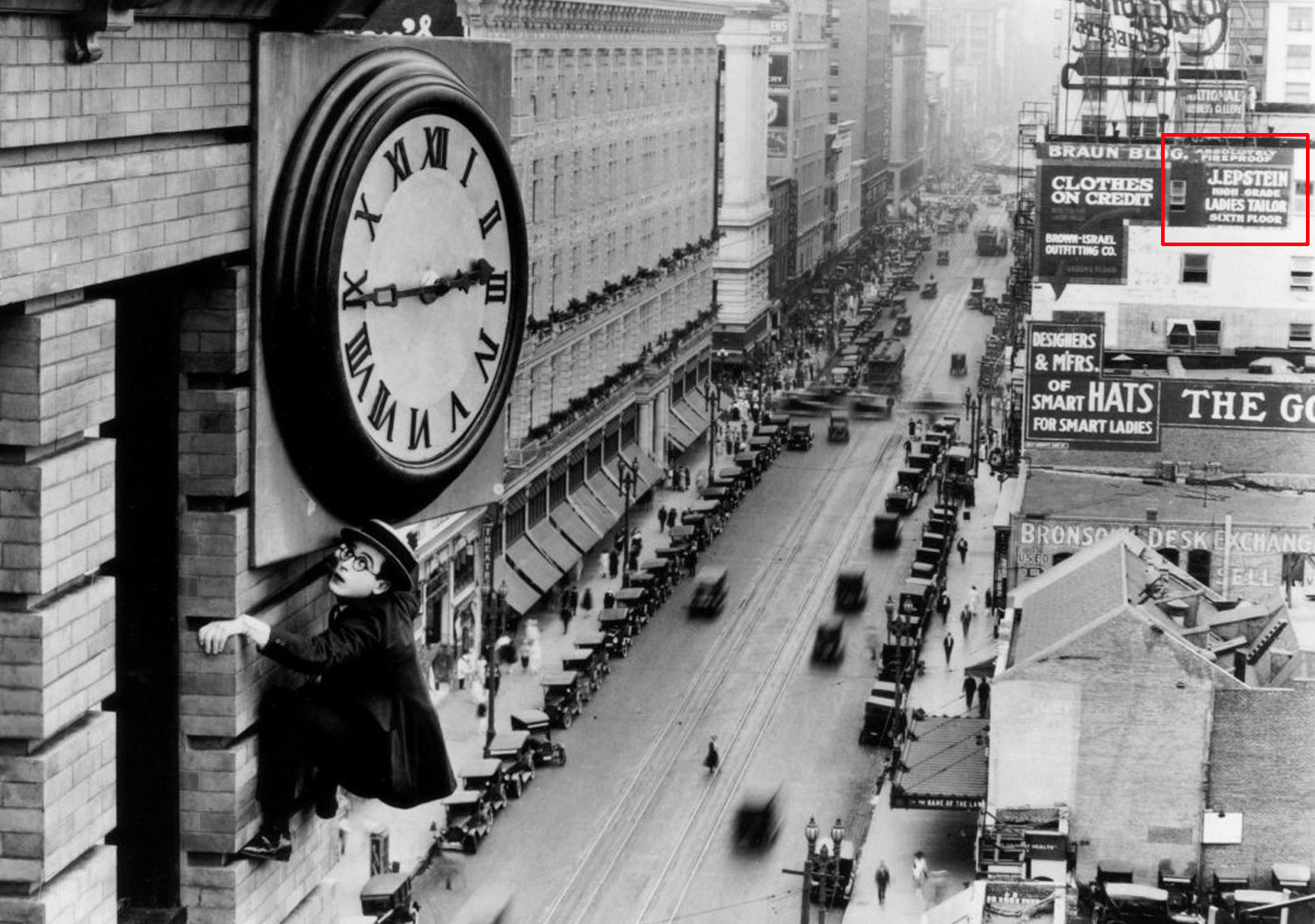 With a can of paint and a cooperative landlord, ladies tailor Jacob Epstein bought himself a bit of movie immortality.  During the iconic skyscraper clock sequence in Harold Lloyd’s 1923 master thrill comedy Safety Last!,  you can clearly see, visible in the background, Mr. Epstein touting his services as painted on the side of the extant building standing at 820 S. Broadway, where he practiced his trade from Room 600 on the 6th floor.   Although his name is now obscured, nearly 90 years later you can still read the lettering “LADIES TAILOR” on the side of the building.  Ironically, while his association with Broadway remains to this day, Mr. Epstein only worked there for a few years, and had already moved to a new shop on Hope Street nearby when the movie premiered.