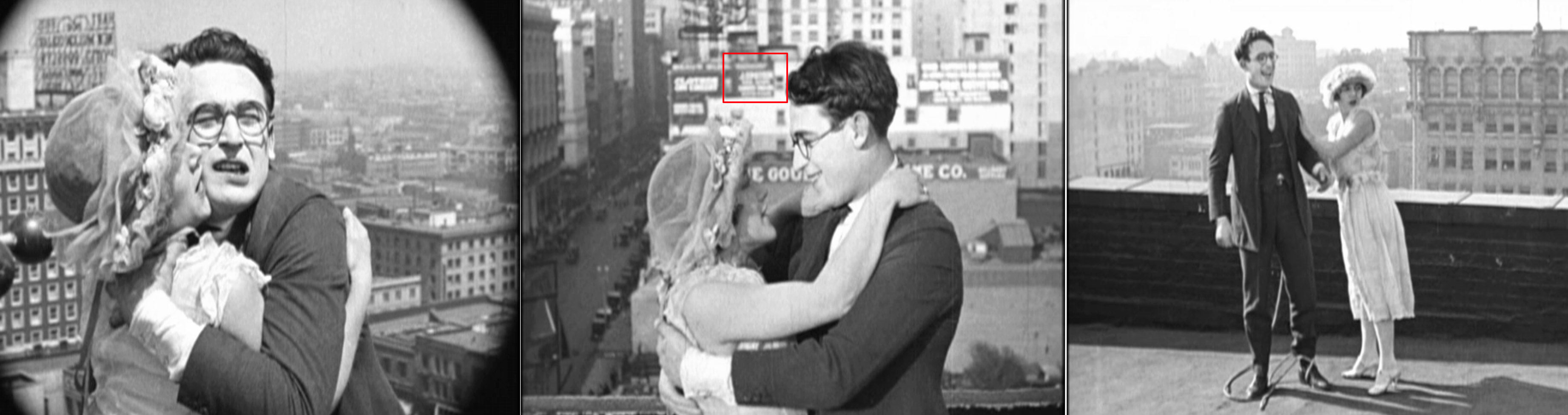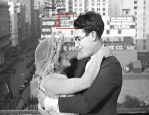 Mr. Epstein also provides an interesting insight into Lloyd’s working methods.  The sequence where Harold and Mildred Davis (the future Mrs. Lloyd) reunite following Harold’s climb of the building was filmed atop three different downtown buildings.  As I explain in my book (pages 113 – 116), a unique reaction shot was filmed atop the Washington Building at 3rd and Spring, with the crest of the extant Million Dollar Theater standing the background, while the majority of the sequence was filmed atop the National Bank Building at 6th and Spring.