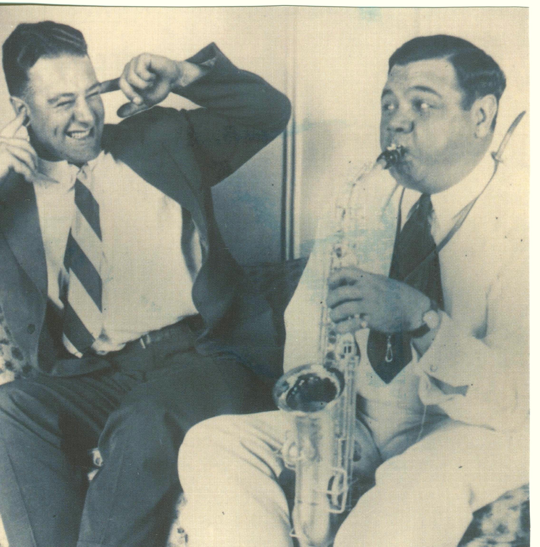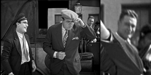New York cabbie Harold Lloyd delivers Babe Ruth to Yankee Stadium in time for the game during this scene from Speedy. At back, the man who followed Ruth in the batting line-up, Yankee first baseman Lou Gehrig.