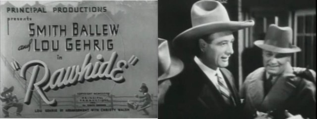 Ruth was no stranger to film, having played himself in the 1920 fictitious biopic Headin’ Home, and several others productions, including the 1942 Gehrig biopic Pride of the Yankees starring Gary Cooper. But I was astonished to learn that Gehrig starred in a feature film as well, a B western called Rawhide (1938). Playing “himself,” Gehrig trades in his bat and glove to become a singing cowboy on his sister’s ranch out west. Shooting began in late January 1938, and the completed film premiered just two months later, preceding what would prove to be Gehrig’s final season playing ball. The following year, Gehrig was formally diagnosed with amyotrophic lateral sclerosis (ALS) on his 36th birthday, and would succumb to the disease in 1941.