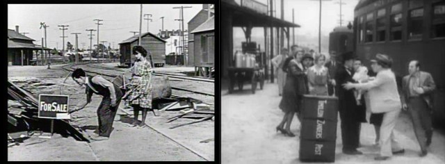 Click to enlarge. The Inglewood train station as it appears in One Week, left, and in Speak Easily, right.