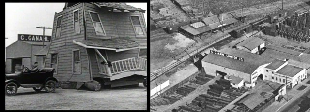 A lumber yard shed appears in One Week, left, in Speak Easily, center, as Buster is being dragged aboard a moving train, and in this vintage aerial view, right.