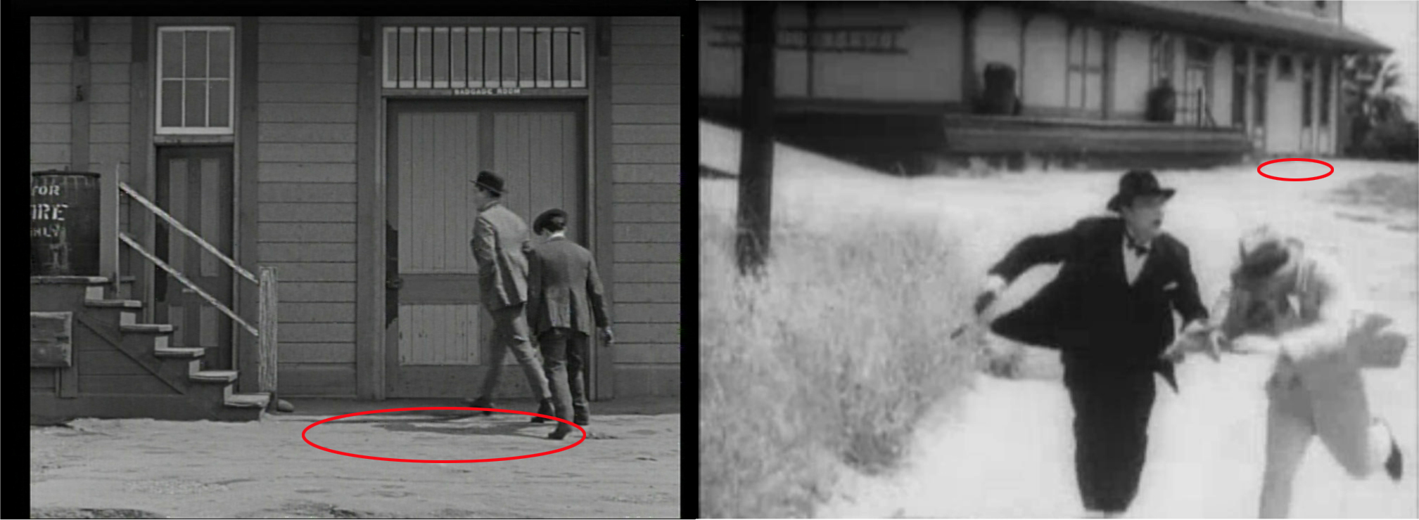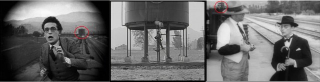 Click to enlarge. In Sherlock Jr, left, Buster shadows his rival behind the Chatsworth train staion. The back of the station appears in Speak Easily, as Buster and Jimmy Durante rush to catch a moving bus. The oval marks the same spot of ground.