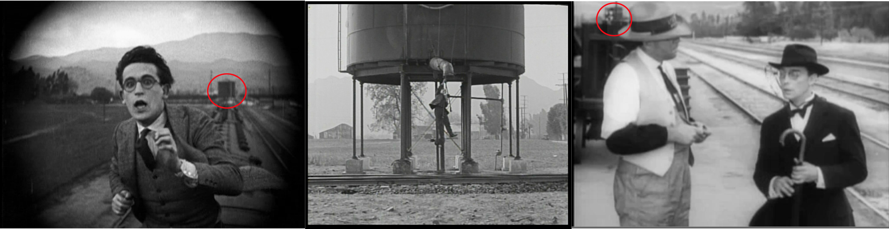 The same water tank appears in Harold Lloyd's Now or Newer, left, in Sherlock Jr. , center, and in Speak Easily.