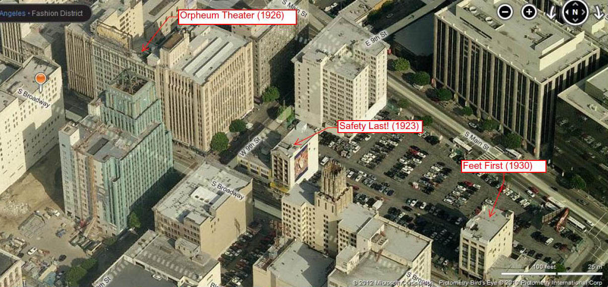 Harold Lloyd filmed his iconic skyscraper clock sequence from Safety Last!, and similar death-dying scenes from his second talking picture Feet First, on the rooftops of extant buildings located just steps from the Orpheum Theater appearing in The Artist. In all, Lloyd filmed five building-climbing stunt pictures in the Los Angeles Historic Core, which I dissect in great detail in my Harold Lloyd location book Silent Visions.