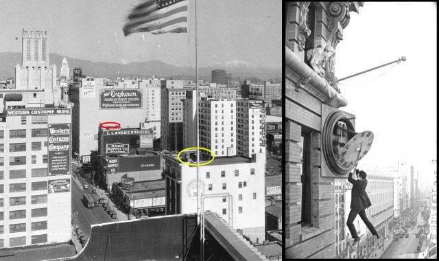 Click to enlarge. Harold Lloyd filmed similar climbing stunts for his second talking feature Feet First atop the Southern California Gas Company Building, the yellow oval in the prior historic photo. His rooftop set appears in greater detail at the right. Lloyd built a similar set and camera tower for the clock sequence in Safety Last!, filmed atop 908 S. Broadway, the building marked with a red oval above. The vertical blade sign for the Orpheum Theater is marked with a yellow box in both images. The Academy of Motion Picture Arts and Sciences. Color image Jeffrey Castel De Oro.