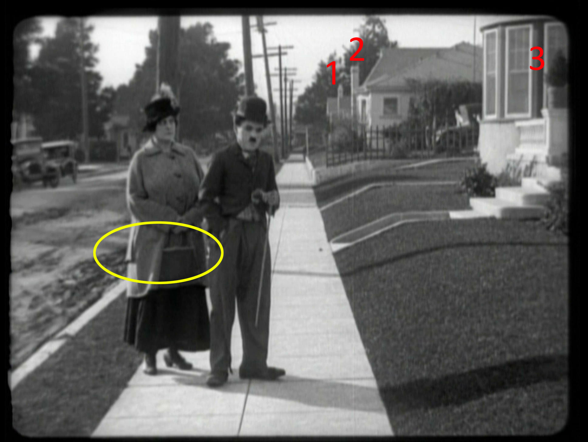 Vintage aerial photos confirm that Charlie also filmed a domestic street scene from Pay Day (1922) within steps of his studio.  During the scene, Charlie’s harridan of a wife, played by Phyllis Allen, confronts Charlie after work, demanding his entire week’s cash wages.  Unbeknownst to Charlie, she has just witnessed him hiding a few dollars in the brim of his hat.  During a comedic exchange, Phyllis first extracts all of the cash from Charlie’s pants, depositing it in her open purse.  For a moment Charlie thinks he has pulled one over on Phyllis, but she then demands to see his hat.  Topping the scene, while Phyllis extracts Charlie’s hidden wages from his hatband, Charlie furtively removes the balance of his pay from her open purse, making a net gain on the transaction.