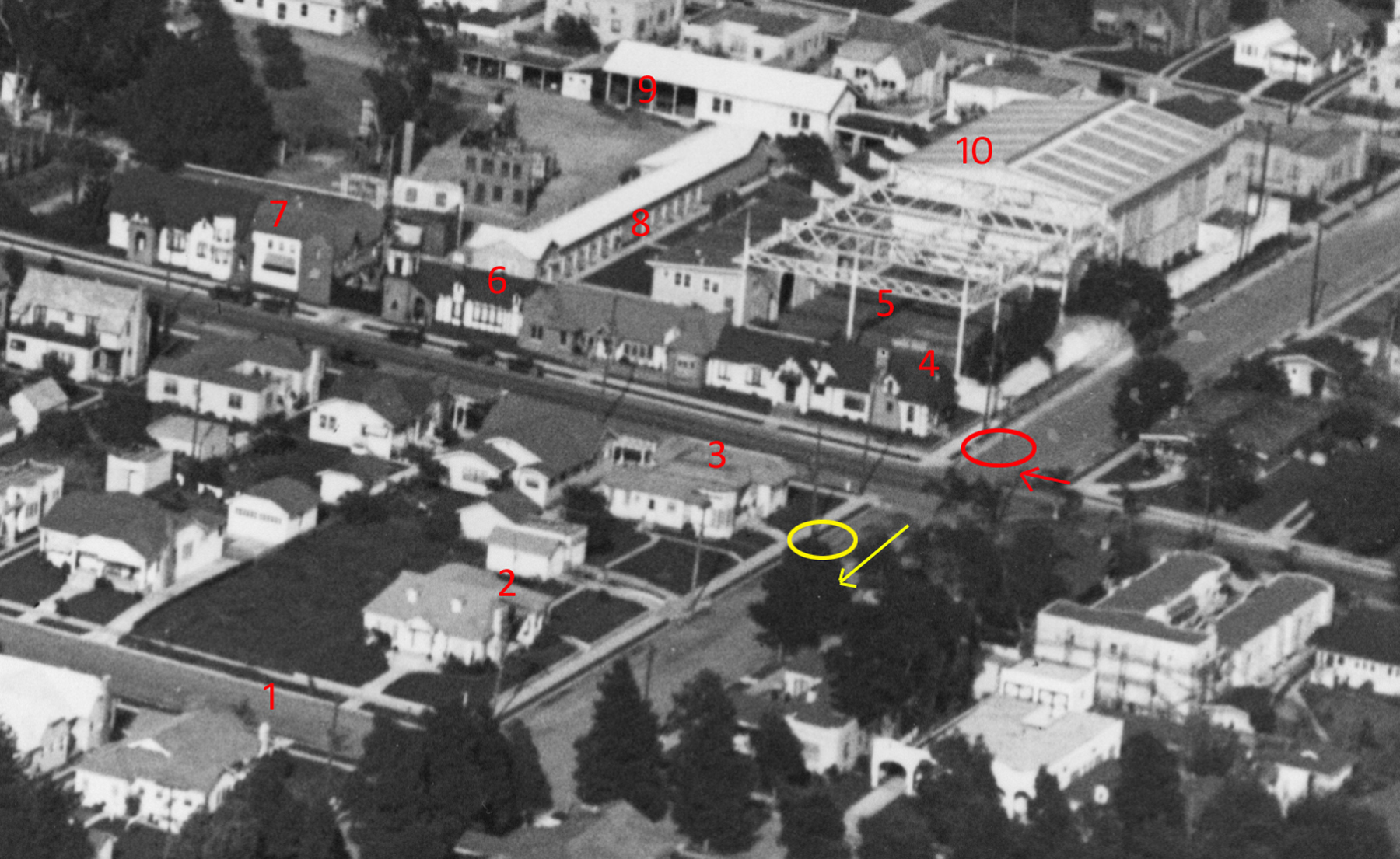 Click to enlarge. The red oval marks the A Day’s Pleasure corner site mentioned above, the yellow oval marks the telephone pole appearing behind Charlie and Phyllis in Pay Day below. The arrows show the camera’s point of view. HollywoodPhotographs.com