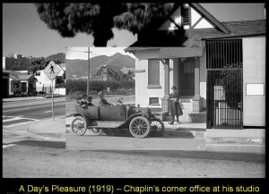 As documented in my Keaton book, and elsewhere on this blog (Mr. Keaton’s Neighborhood), Buster Keaton filmed over four dozen scenes and simple insert shots on the streets adjacent to his small studio.  In a similar vein, as described in my Chaplin book, Charlie Chaplin used the back porch of his studio office for a domestic scene in A Day’s Pleasure (1919) (left, see post Chaplin Medley, slide 7).