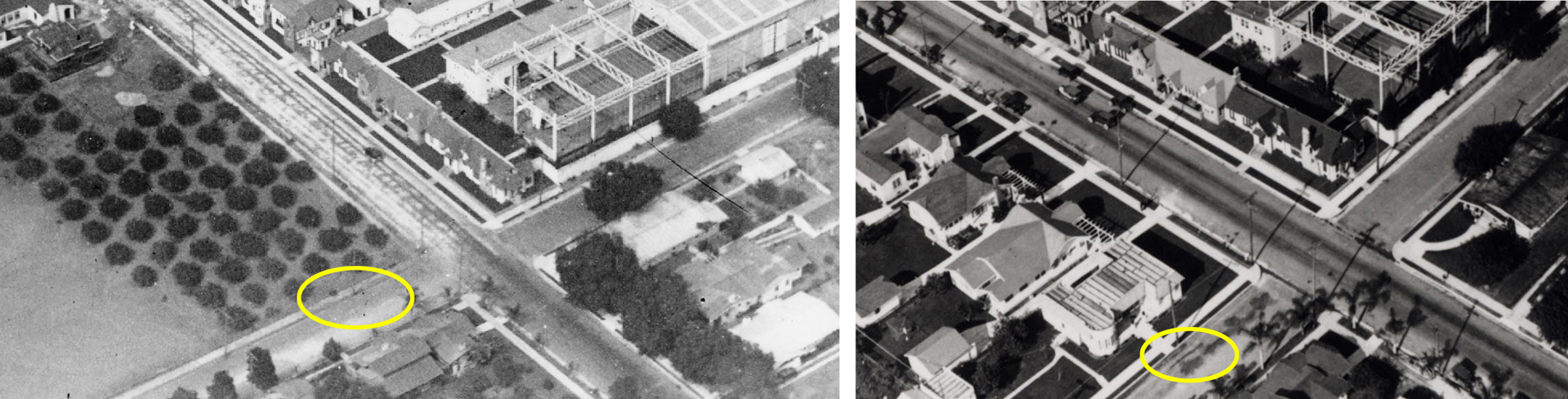 Matching views, from 1918, and 1922, showing the Pay Day filming spot (oval).  Jeffrey Vance Collection – Association Chaplin