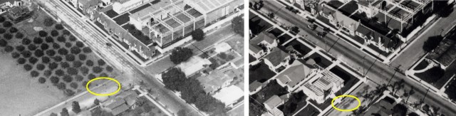 Above, aerial views of the Pay Day filming spot, the NW corner of De Longpre and La Brea, before and after the bungalow at 7101 De Longpre was completed between 1919 and 1922.  Below, a Google view of the NW corner of De Longpre and La Brea today – the circular bay bungalow (3) to the left, the Chaplin corner office (4) barely visible through the trees on the right.