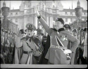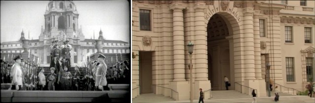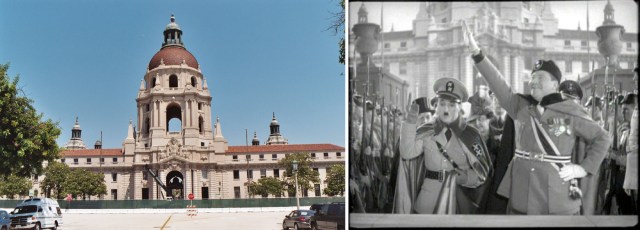 Location filming has been staged in Los Angeles now for well over a century. It should come as no surprise then that contemporary television shows share exterior settings that once appeared in classic films. In one prior post I explain how The Office TV show shares a connection to Harold Lloyd and film noir. In another recent post I show connections between the popular crime procedural Bones and Buster Keaton. Now its time to show the connection between Charlie Chaplin, and the popular mockumentary style sitcom Parks and Recreation. During Chaplin’s bold political satire The Great Dictator (1940), Charlie’s character Adenoid Hynkel stages an enormous rally to greet Dictator Benzino Napaloni (played by Jack Oakie). Although filmed inside a soundstage, the Pasadena City Hall appears as a backdrop during the scene.