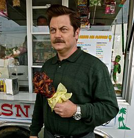 The same Pasadena City Hall stands in for the City Hall of Pawnee, Indiana, the fictional town portrayed in the Parks and Recreation television show. Given that Pawnee is supposed to be just an average town, the show rarely (never?) depicts the building’s massive baroque dome, but instead uses tight shots of the entrance arch, flanked by the words “CITY HALL,” giving the building a more modest sense of scale. One thing in the show that is not modest is popular character Ron Swanson’s mustache. The meat-eating Libertarian played by Nick Offerman sports a mustache three times larger than Chaplin’s.
