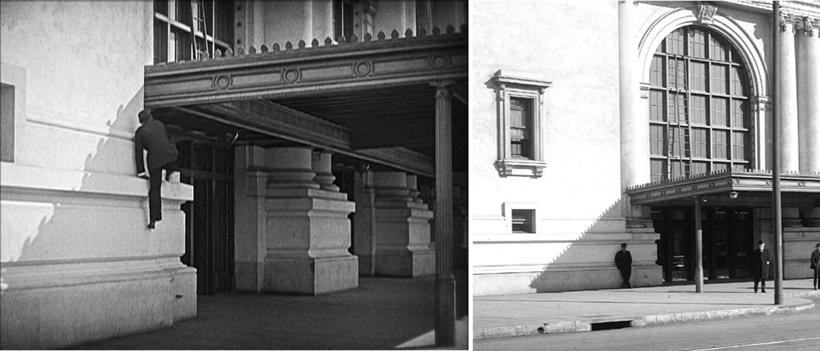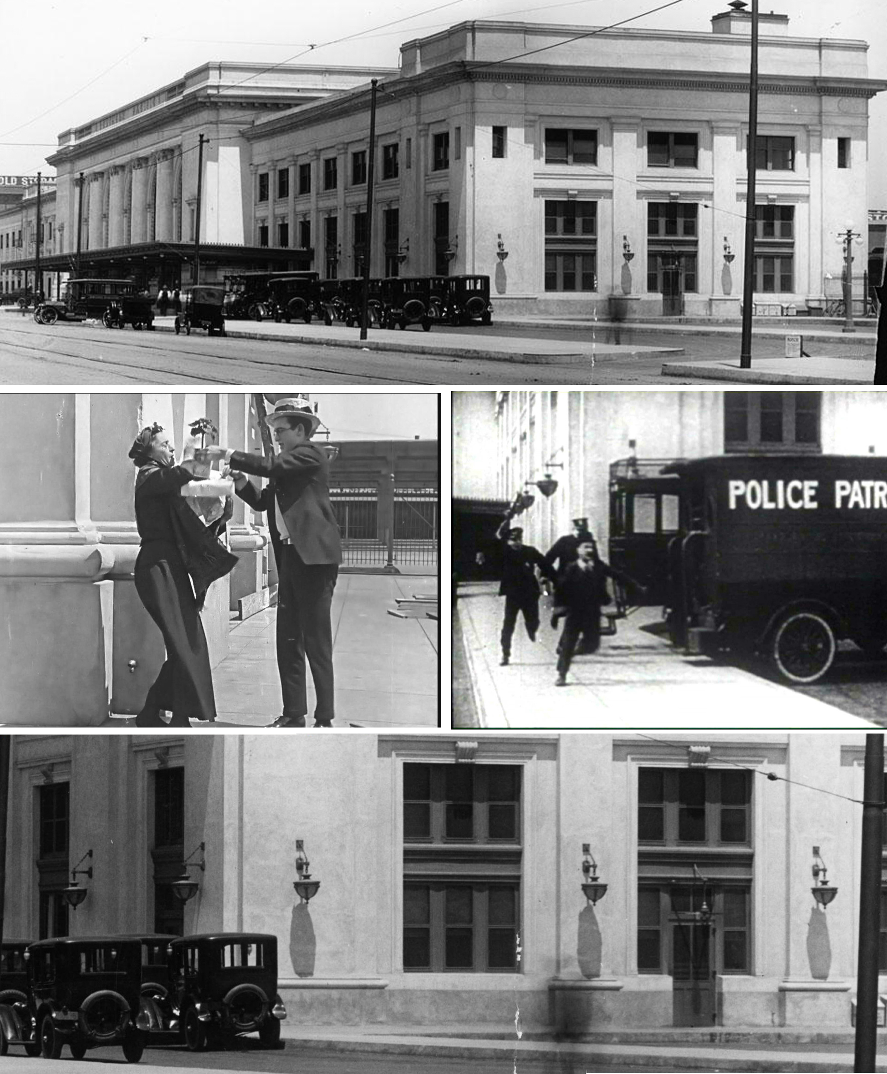 Filmmakers not only captured the western (front) side of the Southern Pacific Depot, the south end of the station (the side facing the sun all day) also appears in vintage comedies. In Just Neighbors (1919) (see left below) Harold Lloyd races around the station corner attempting to catch the next train home, when he runs into several people blocking his way. In Be Reasonable (1921), Billy Bevan (see right below) flees the police by racing south from the station during a lengthy chase, presaging Buster Keaton’s similar chase in Cops (1922). Notice the former station’s distinctive light fixtures along the corner walls.