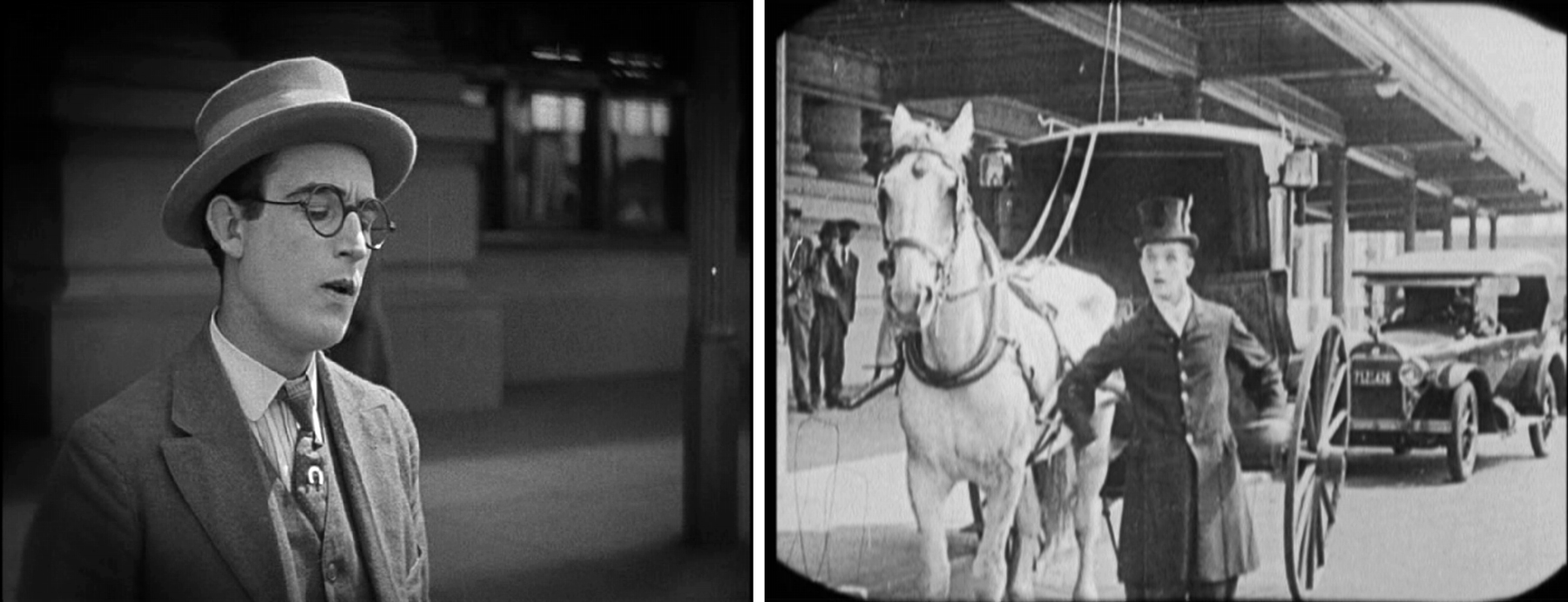 Below, Harold Lloyd at left, in front of the Southern Pacific Depot in Girl Shy, and Stan Laurel playing a hansom cab driver in his pre-Oliver Hardy solo comedy Mother’s Joy (1923).