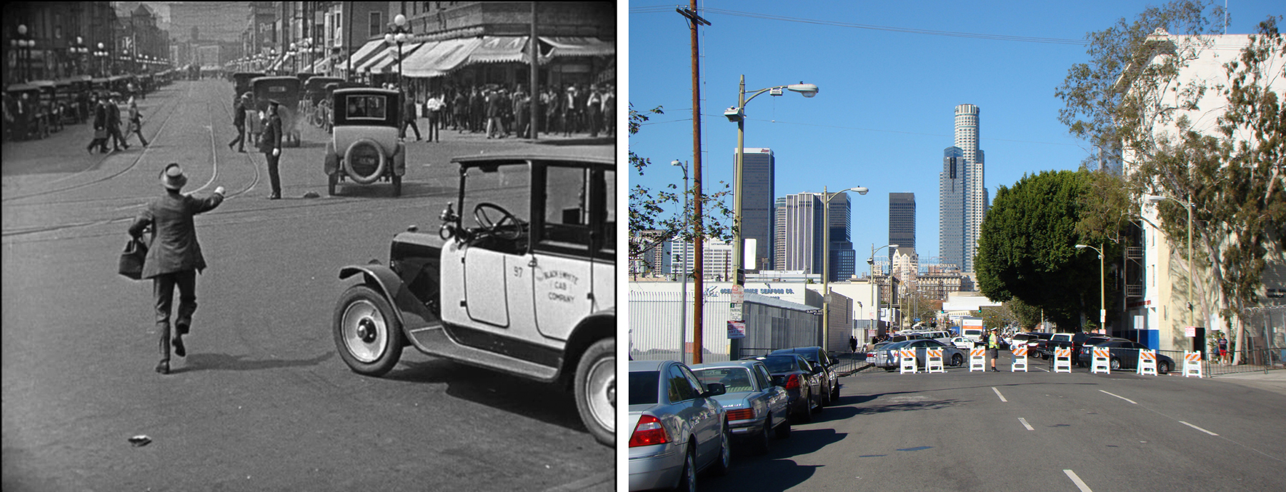 Below, the extant Rosslyn Hotel (1913) at 5th and Main appears in the background during a scene from Girl Shy as Harold runs west after Jobyna’s taxi cab down 5th Street from the Southern Pacific Depot. In the matching modern view, the US Bank Tower, the tallest building on the West Coast, dominates the skyline. At 1,018 feet, the building stands nearly seven times as tall as the 150-foot height limit imposed in Los Angeles for many decades. I don’t think anyone involved with filming Harold’s scene could have imagined that the downtown skyline would someday appear this way.