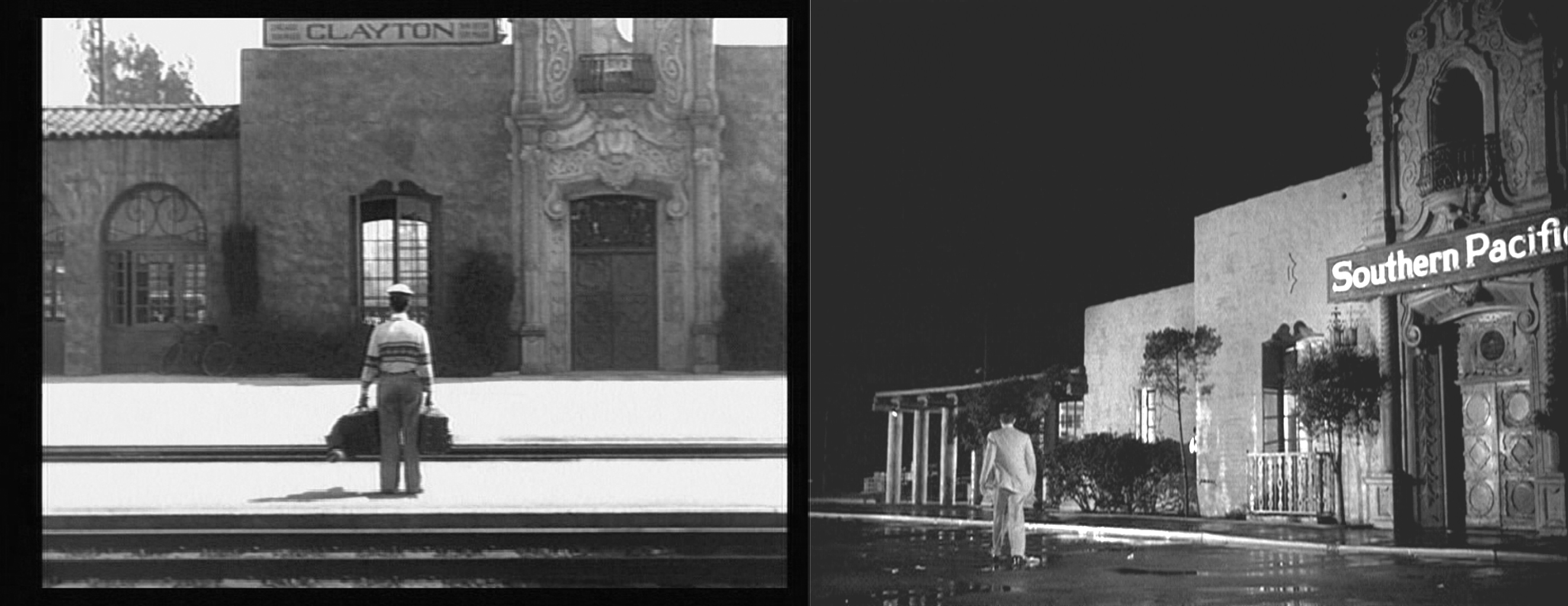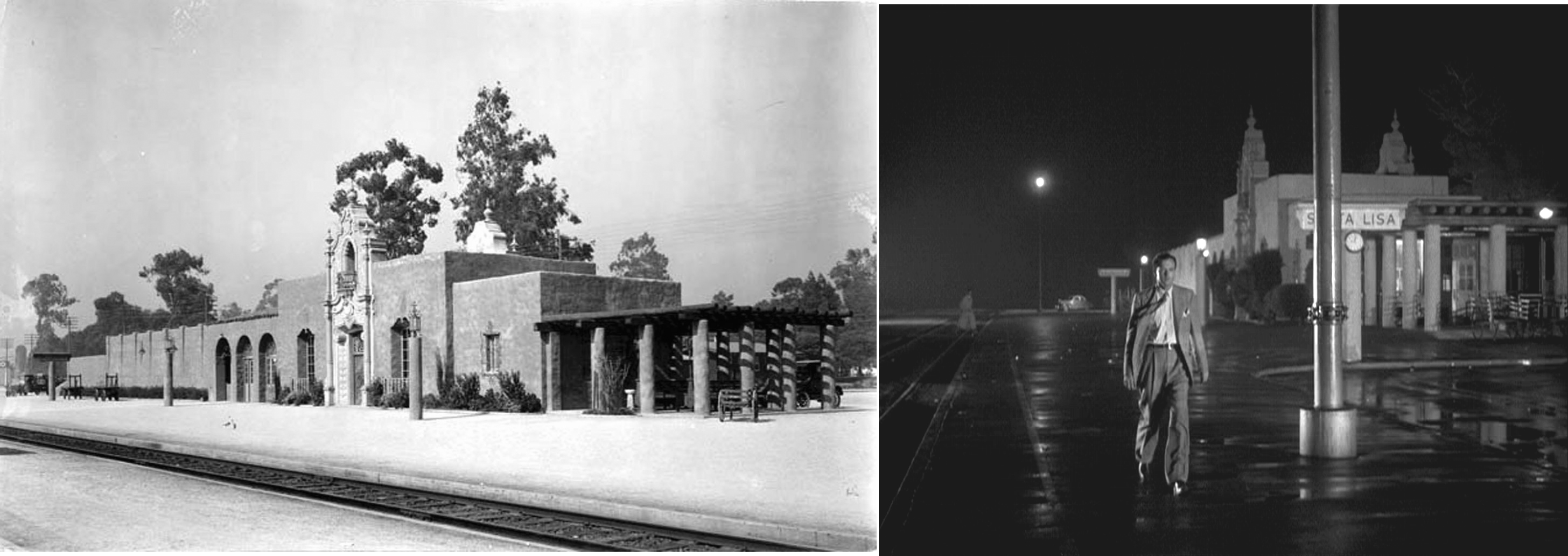 As Lindsay Blake proves in her wonderful I’m Not a Stalker film and TV location blog, the noir classic Double Indemnity (1944), starring Barbara Stanwyck and Fred MacMurray was NOT filmed at the Glendale station, but actually the Burbank station, even though a “GLENDALE” sign appears during the scenes in the movie.   Instead, for some reason they put a “GLENDALE” sign on the Burbank station for the shot.  You can read about this and several other movies filmed at the Glendale station in Lindsay’s post HERE.