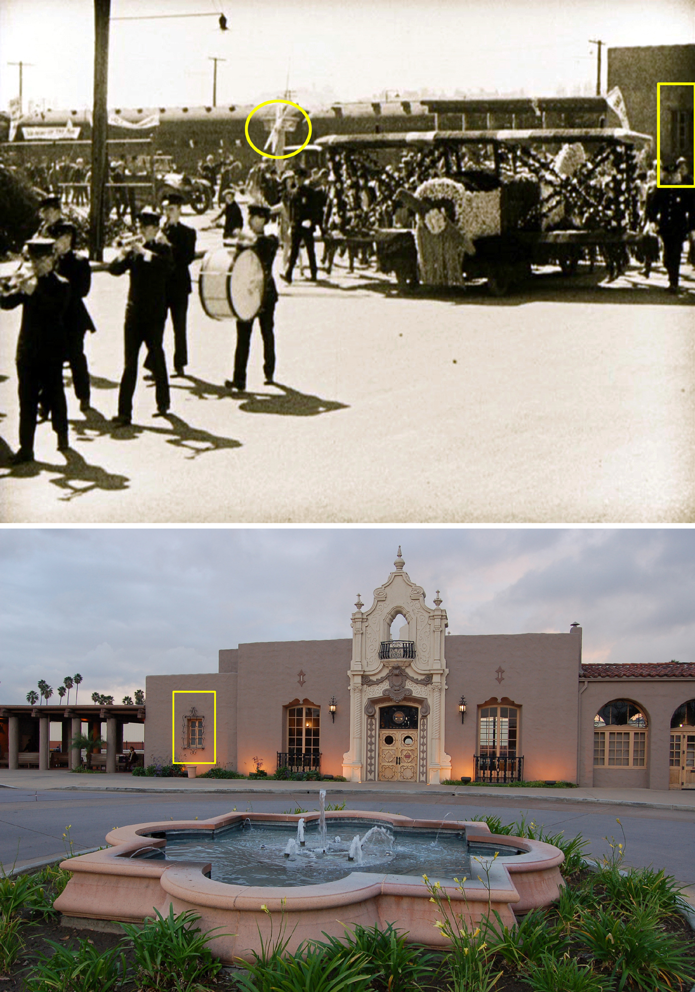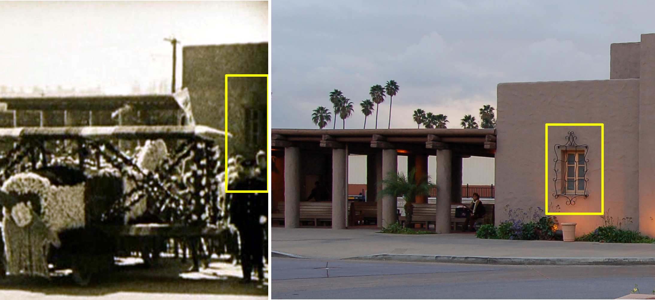 Continuing with posts concerning Southern Pacific depots appearing in silent film (see HERE and HERE), a concluding scene from Wings was filmed at the SP depot in Glendale, now called the Glendale Amtrak train station, the same station Buster Keaton used the same year when filming his campus comedy College (1927) and also appearing in the film noir classic Act of Violence (1948) (see both below).  Towards the end of Wings Buddy Rogers’s character returns home from the war, and receives a hero’s welcome at his local train station.  Although very little of the station appears on camera, several clues confirm the site.  Since Buddy’s white picket-fence home-town was implied to be set in “middle America” (i.e., not in Southern California), I have to infer that the elaborate Spanish baroque-style building was deliberately kept off camera to avoid breaking the illusion.