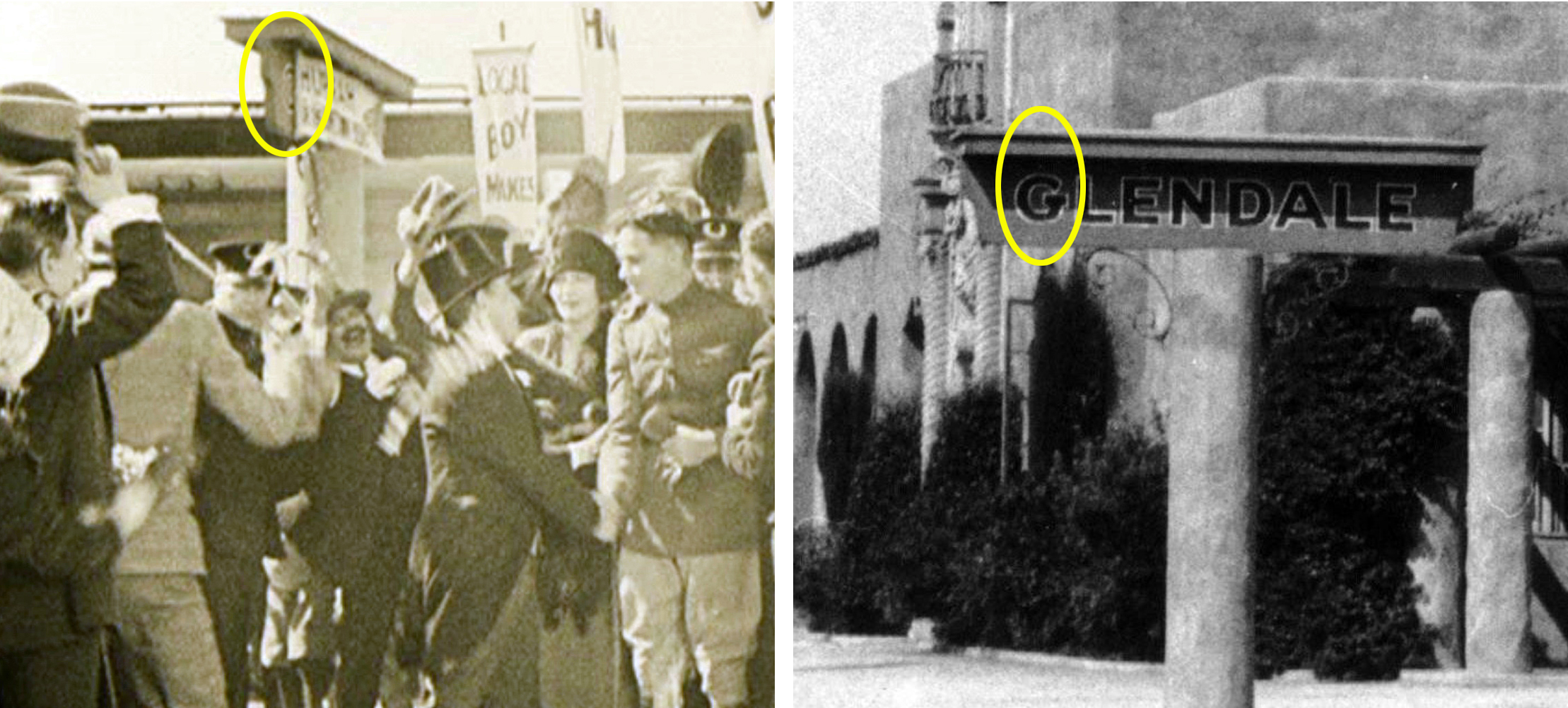 Click to enlarge and compare the signs – you can see the letter “G” outlined in white in both images.  They attempted to cover up the Glendale sign with a “welcome ” sign when filming.  USC Digital Archive.