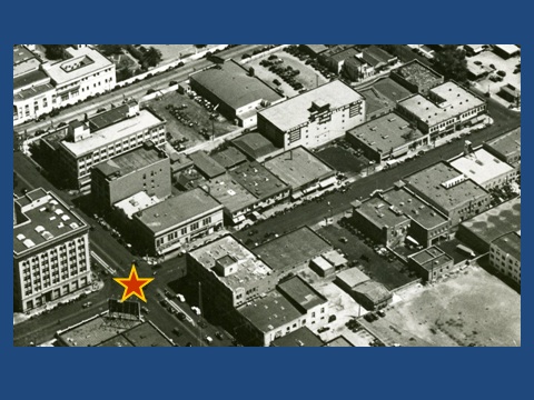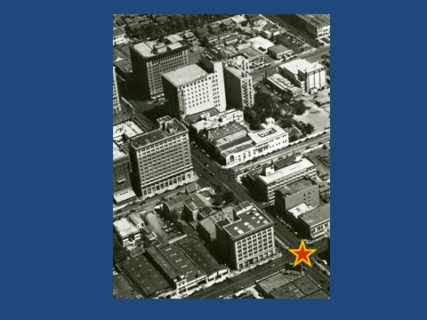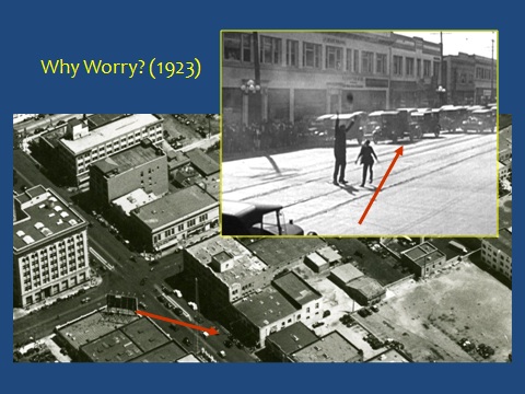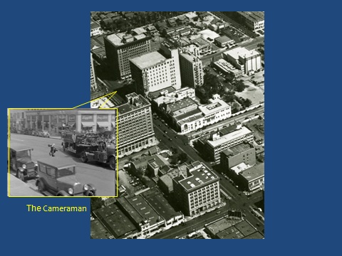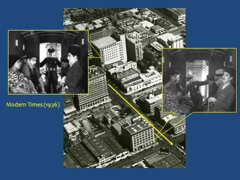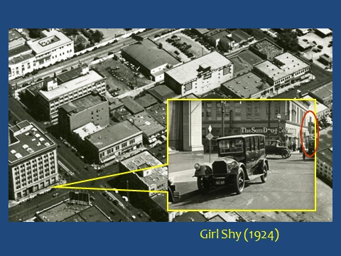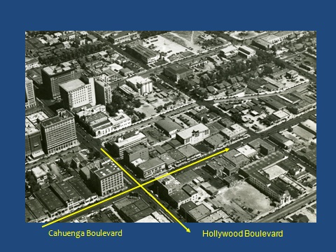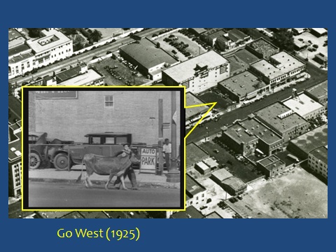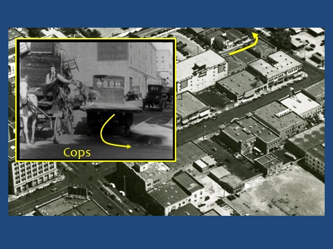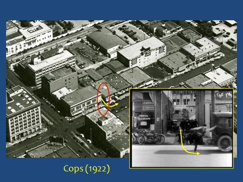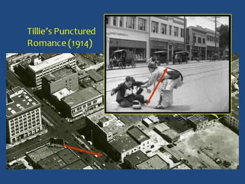 The intersection of Hollywood Boulevard and Cahuenga Boulevard was a popular film setting for silent-era comedies. At the far end of this post is a link to download an animated 15 MB PowerPoint presentation showing thirteen (but not all) Chaplin, Keaton, and Lloyd filming locations near this historic intersection. If you prefer, here are some static images from the slide show. You can read more about the Toberman Building below appearing in Tillie’s Punctured Romance (1914) at this link HERE.