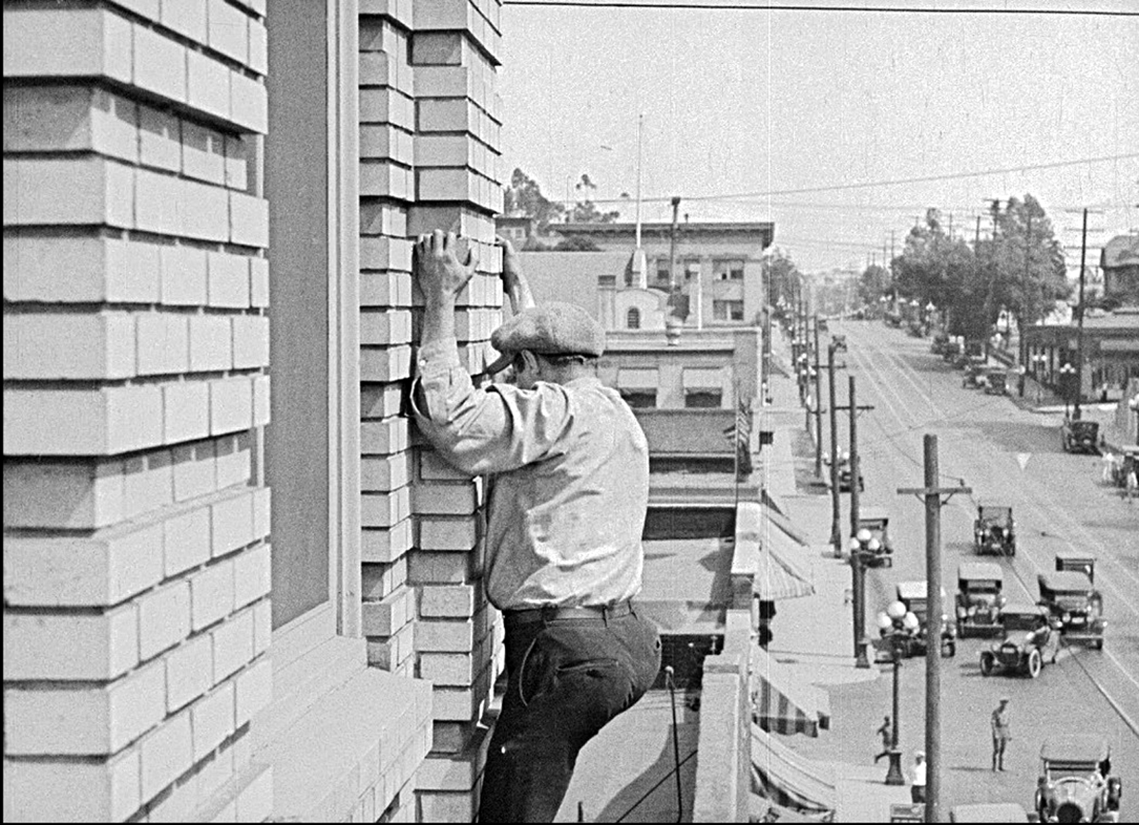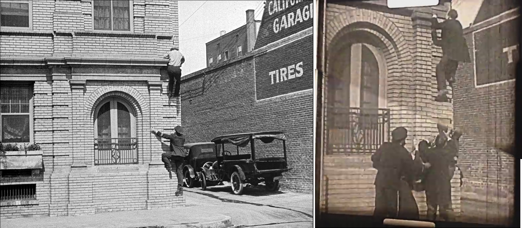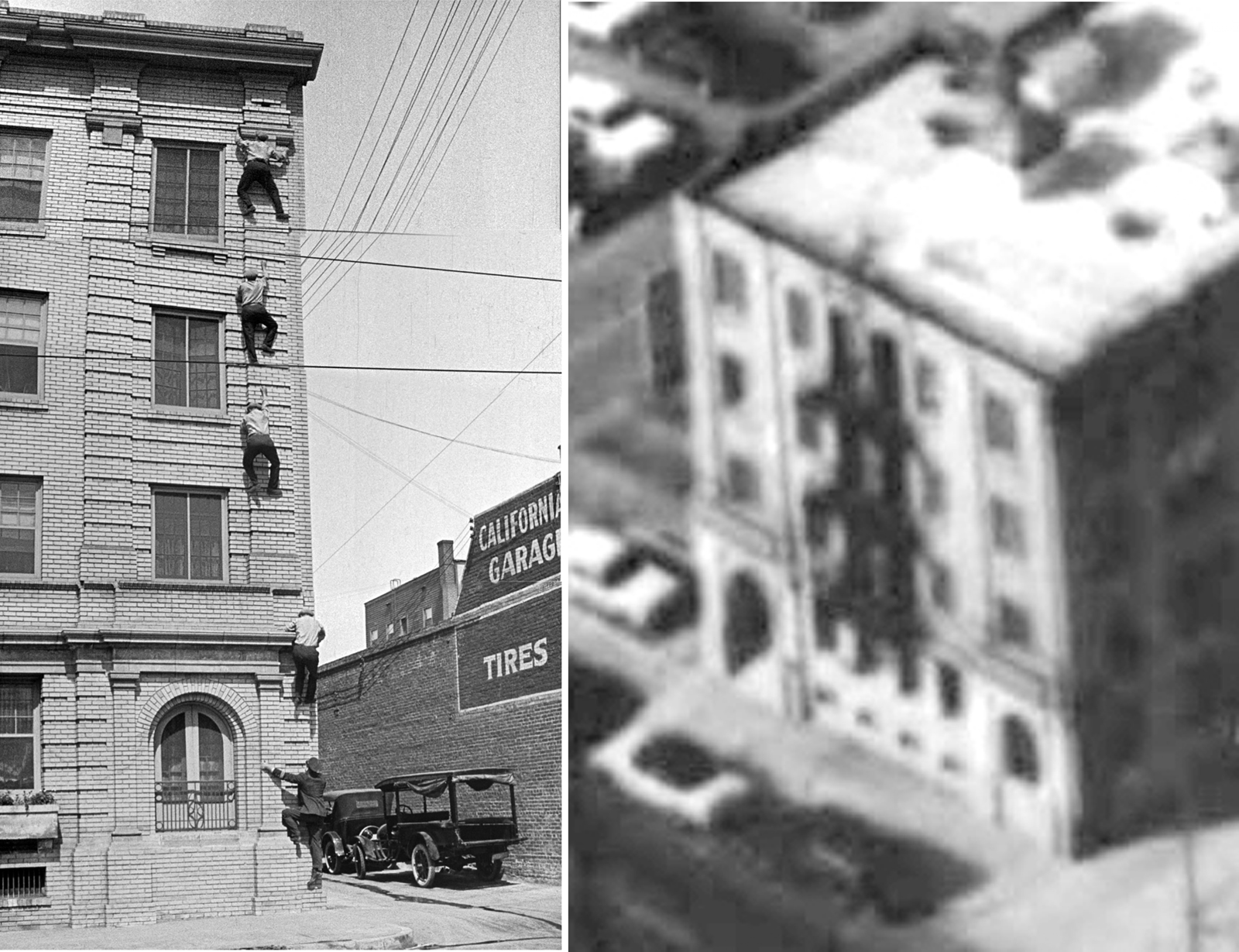 But a mysterious ninth building belongs in the Lloyd Thrill Picture Hall of Fame (see left). As explained in a prior post, we learn early in Safety Last! (1923) that Harold’s roommate Bill Strother can climb tall buildings when we watch him scale a four-story apartment in order to escape from a cop. If you click the image of Bill below, you can see how the climbing was controlled with his hands.