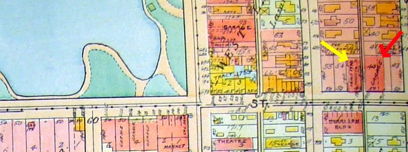 The Dresden Apartments (yellow arrow) and California Garage (red arrow) on W 7th east of MacArthur Park