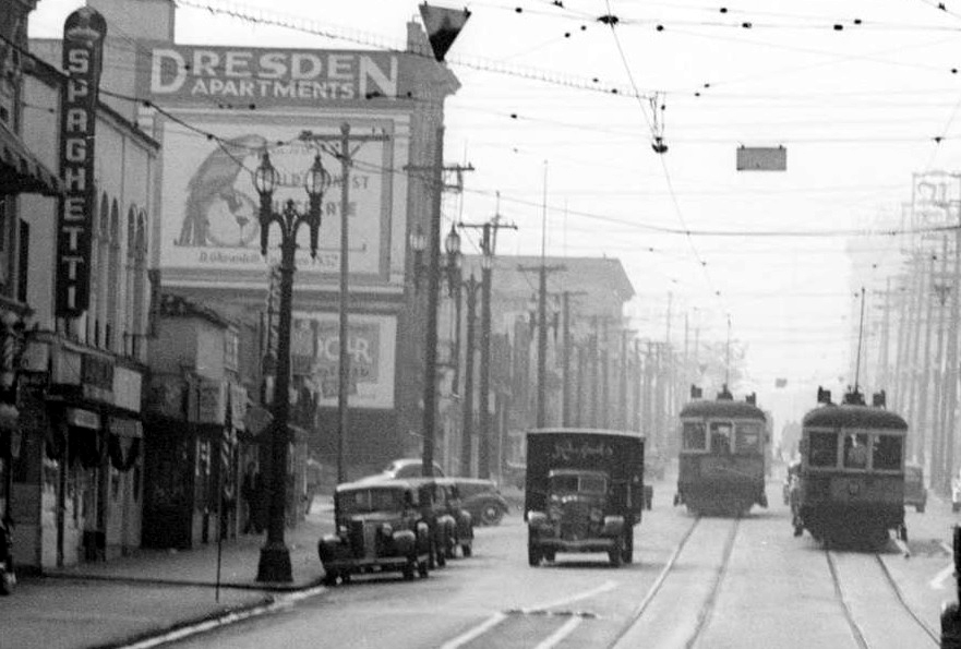Below, a 1940 view east down W 7th Street towards the Dresden Apartments. The Sorrento Apartments stand tall further down the street.
